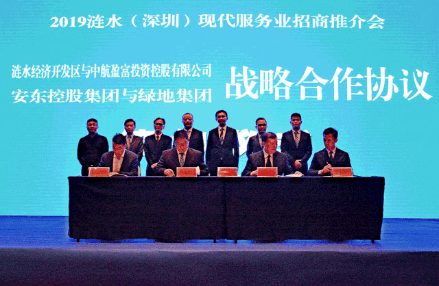 2019年10月18日,漣水(深圳)現(xiàn)代服務(wù)業(yè)招商推介會(huì)在深圳市福田區(qū)舉行,縣委副書記、縣長時(shí)勇出席會(huì)議并致辭??h委常委、常務(wù)副縣長洪然,縣政府黨組成員、經(jīng)濟(jì)開發(fā)區(qū)管委會(huì)主任周宏昌等出席活動(dòng)。在本次招商推介會(huì)上,董事長、總經(jīng)理禹成余代表安東控股分別與藍(lán)光控股集團(tuán)、綠地集團(tuán)達(dá)成投資15億元的綠色生態(tài)住宅項(xiàng)目和20億元的高鐵城際空間站項(xiàng)目,為漣水現(xiàn)代服務(wù)業(yè)發(fā)展注入強(qiáng)勁活力。